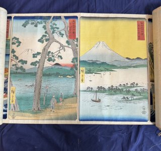 初代 歌川広重による浮世絵「富士三十六景 左側の作品:はこねの湖すい(箱根の湖水)と右側の作品:相模江之島入口(さがみ えのしま いりぐち)」です。 富士三十六景は広重がその...