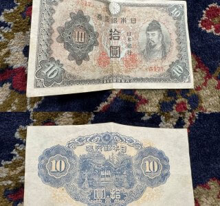 日本銀行券(い号券)の「改正不換紙幣10円札(3次)」です。 表面右側に和気清麻呂の肖像、中央下方に総裁之印および発券局長の印章、裏面には青の単色刷りで和気清麻呂を祭神とする護王神社が描かれてい...
