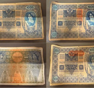 第一次世界大戦後のオーストリア・ハンガリー帝国の1000クローネ紙幣です。 表面中央には帝国の紋章である「双頭の鷲」が配置され、右側には花輪を冠した若い女性の肖像が描かれています。青を基調とした...
