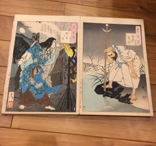 月岡芳年(1839-92)による浮世絵「月百姿 左側: 賊巣の月 小碓皇子(ぞくそうのつき おうすのみこ)/右側: つきの発明 宝蔵院」です。 「月百姿(つきのひゃくし)」は...