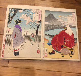 月岡芳年(1839-92)による浮世絵「月百姿 左側: 廓の月/右側: きよみかた空にも関のあるならば 月をとゝめて三保の松原」です。 「月百姿(つきのひゃくし)」は月をテー...