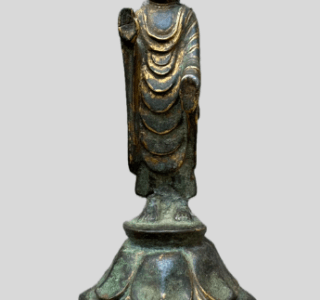 インドの伝統的な様式を反映した「黄銅製 釈迦如来像」をお譲りいただきました。小像ながらも細部にまでこだわりが感じられる、趣深い仏像です。 両手は転法輪印(説法印)を結び、釈迦が説法を行う場面を象...