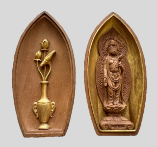 こうした仏教美術は、寺院の什器として大切に受け継がれてきた歴史的背景があり、経年による特有の風合いや深い古色がその魅力を一層引き立てています。