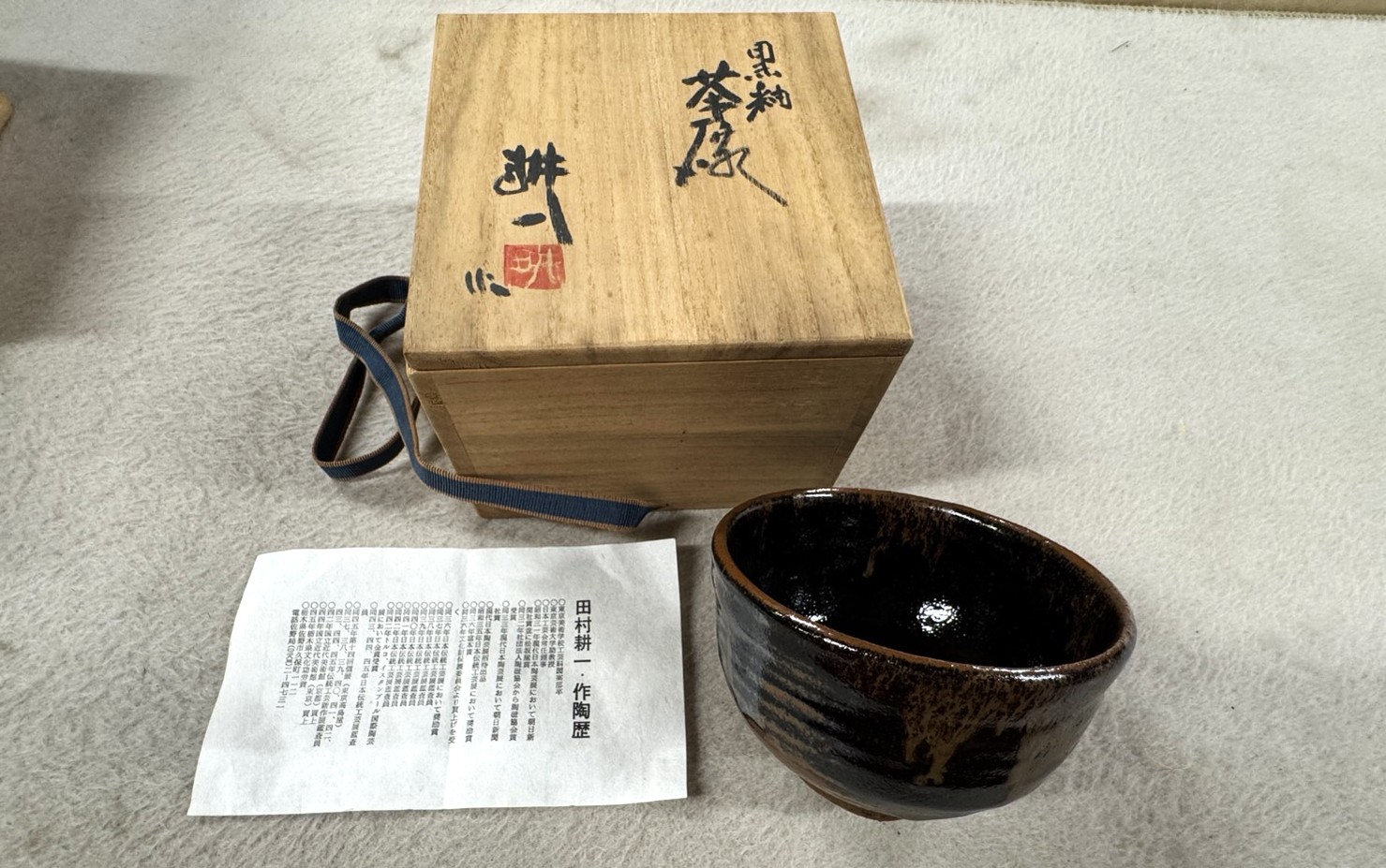 陶芸家・田村耕一による黒釉茶碗をお譲りいただきました。端正な造形と釉薬の変化が調和し、手に取るたびに深みある表情を楽しませてくれる一碗です。