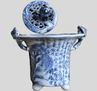宮川香山は幕末に京都から横浜へ移り、輸出陶磁器の旗手としてその名を轟かせました。初期の「高浮彫」で知られるダイナミックな装飾から、中盤以降は釉下彩や染付といった東洋的で落ち着きある美の追求へとその作風を深化させており、本作はまさにその円熟味を感じさせる一点です。