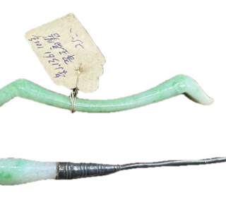 中でも特に目を引くのは、美しい翡翠製の帯留です。深みのある緑色の硬玉を使用した楕円形の帯留は、石質の良さと丁寧な研磨技術が際立っています。また、薄緑色の翡翠を用いた透かし彫りの品も見られ、石の持つ自然な美しさを最大限に活かした職人技が光ります。