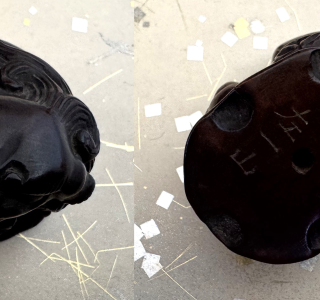 裏には「正利」と銘が刻まれています。牛が地面に伏せている姿は臥牛と呼ばれ、天神様(菅原道真公)の使いや、豊かさ、忍耐の象徴として、江戸時代~明治時代にかけて人気のあるモチーフでした。菅原道真公と深い縁のある臥牛の像は、京都の北野天満宮や福岡の太宰府天満宮などに鎮座し、頭を撫でると学業成就や病気平癒のご利益がある「撫牛(なでうし)」として親しまれています。