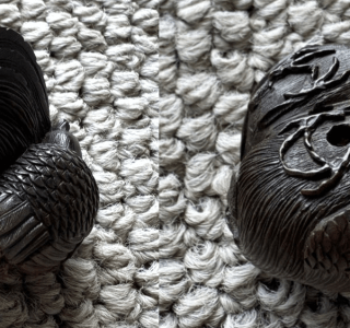 こちらは後ろ向きに流れるような力強い角、がっしりとした体は今にもむっくりと起き上がりそうな力強さが秘められています。腹部の蹄もリアルに彫り込まれており、「見えないところまで手を抜かない」という職人のこだわりが詰まった作品といえます。