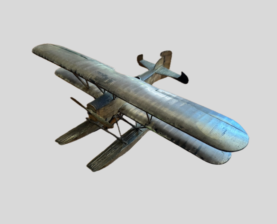 かつての空への憧憬を形にしたような、鈍い輝きを放つ銀製の複葉水上飛行機模型をお譲りいただきました。
