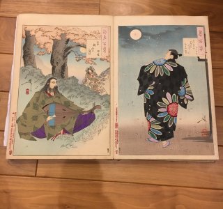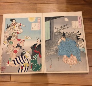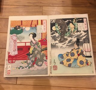 月岡芳年(1839-92)による浮世絵「月百姿 左側: 宮路山の月 師長(みやじやまのつき もろなが)/右側: 名月や来て見よかしのひたい際 深見自休(ふかみじきゅう)」です。 ...