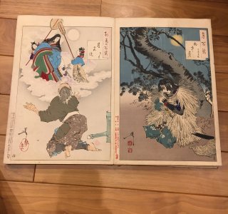 月岡芳年(1839-92)による浮世絵「月百姿 左側: 月宮迎 竹とり(げっきゅうむかえ たけとり)/右側: 雨中月 児島高徳(うちゅうのつき こじまたかのり)」です。 「月...