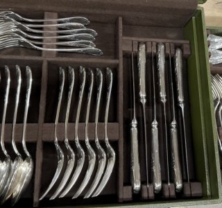 英国王室御用達の老舗銀器ブランド、マッピン&ウェブ(Mappin & Webb)の鮮やかなスカイブルーと深いネイビーのコントラストが目を引く、銀製七宝(エナメル)のスプーンセットをお譲りいただきました。有線七宝(クロワゾネ)の技法を用いた逸品です。