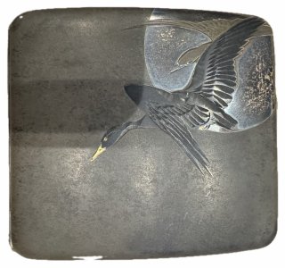 素晴らしい意匠の金工の箱をお譲りいただきました。精緻な技術が光るこの作品は、深い鉄の地に月に向かって飛び立つ一羽の雁が描かれた、詩情あふれる逸品です。 この箱の特筆すべき点は、象嵌(ぞうがん)や...
