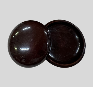中村直人による木彫「蹲る鶴」の香合です。羽をたたみ、地に身を沈めた鶴の姿を端正に彫り出し、繊細な彫刻表現によって羽根の質感や鶴の気品を巧みに表現しています。香合としての機能性とともに、彫刻作品としての存在感を兼ね備えた作品です。