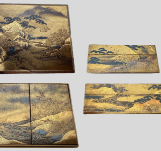 左は、このセットの蓋部分ですが、日本の自然美を凝縮したかのような見事な蒔絵(まきえ)の技法が用いられた逸品です。雄大な滝の流れ、雲間から覗く山々、松や梅などの文様が立体感豊かに表現されています。