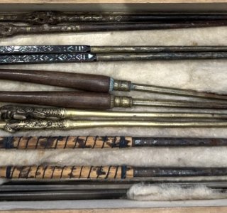 そして、右側が香合セットです。円形の外箱の中には、大小9つの香合が収められています。中央の大きな香合を囲むように、丸みを帯びた香合が並び、その全てに繊細な竹梅などの文様が彫金で施されています。