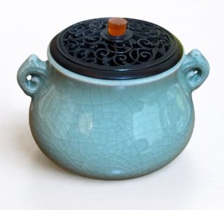 唐草文の木製香炉(瑪瑙の玉石の猿の意匠が摘みに配されています)