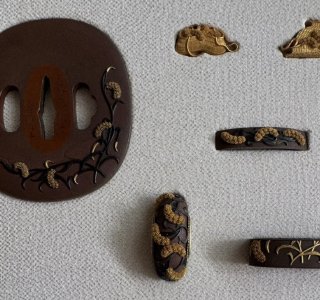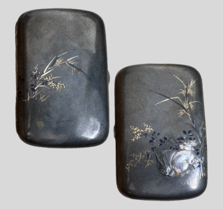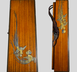 美しい木目に精巧な金工装飾が映える、格調高い木製箱をお譲りいただきました。 本作の最大の特徴は、木の質感を活かしつつ、その表面に躍動感あふれる尾長鳥と菊の繊細な金工細工を貼り付けている点にありま...