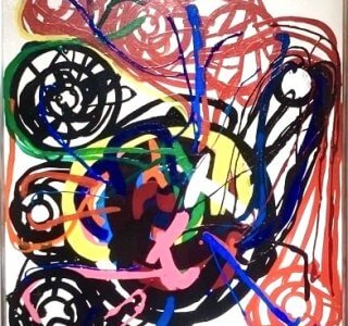 田中敦子による1973年制作の抽象絵画作品をお譲りいただきました。 本作は、画面中央に集約された色彩の塊と、それを取り巻くように展開する自由な線の動きが印象的な一枚です。鮮烈な赤や青、黒の線が絡...
