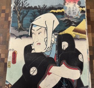 三代 歌川豊国(歌川国貞)による浮世絵「東海道五十三次之内 戸塚 早野勘平(とつか はやのかんべえ)」です。 「役者見立東海道」と呼ばれるシリーズ作品の一つで、手前に役者絵、...