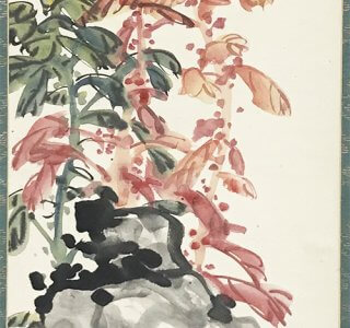 清末民初の巨匠である呉昌碩による紅梅の掛軸です。呉昌碩は書・画・印を兼ね備えた「三絶」の芸術家として広く知られ、近代文人画の流れを代表する存在です。 本作に描かれているのは、冬の寒さの中に凛とし...