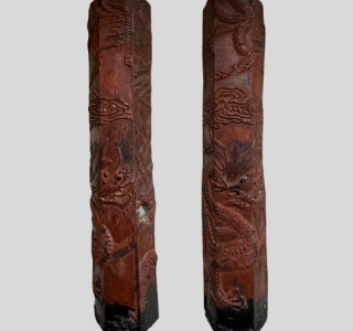 力強い龍の彫刻が施された見事な木彫香筒をお譲りいただきました。 香筒は線香などを保管し、持ち運ぶための茶道具ですが、本作はその実用性を超え、ひとつの彫刻作品としての風格を漂わせています。 ...