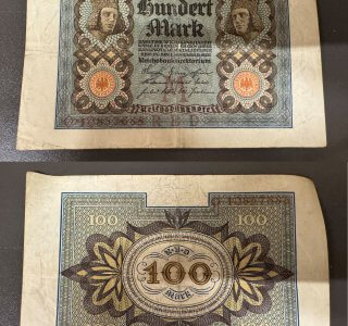 - 第一次世界大戦後のワイマール共和国(ヴァイマル共和政)時代、1920年にドイツ帝国銀行が発行した100マルク紙幣(ライヒスバンクノート)です。表面の左右に描かれている人物像は、バンベルク大聖堂にある1...