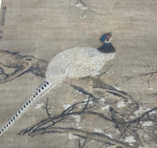 早春の凛とした空気を感じさせる、晴江蔡岳筆「古梅白雉子図」をお譲りいただきました。柔らかな梅の香がほのかに立ちのぼるかのような、清々しく格調高い一幅です。 本図は絹本着色による花鳥図で、白梅の古...