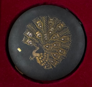 黒の地を背景に、優雅に羽を広げた孔雀の姿が黄金色の象嵌で鮮やかに描き出された、意匠性の高いコンパクトをお譲りいただきました。 こちらは、1960年代から70年代にかけて東京都台東区を拠点に活動し...
