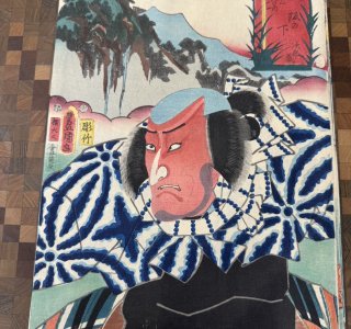 三代 歌川豊国(歌川国貞)による浮世絵「東海道五十三次の内 藤沢 小栗判官(ふじさわ おぐりはんがん)」です。 「役者見立東海道」と呼ばれるシリーズ作品の一つで、手前に役者絵...