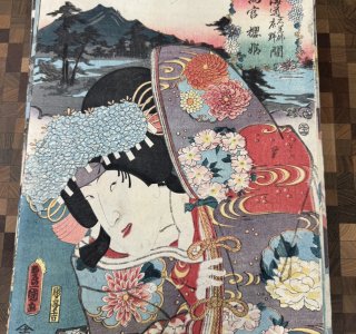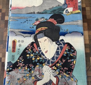 三代 歌川豊国(歌川国貞)による浮世絵「東海道五十三次の内 白須賀二川間 山むら 義経(しらすか ふたがわかん やまむら よしつね)」です。 「役者見立東海道」と呼ばれるシリ...