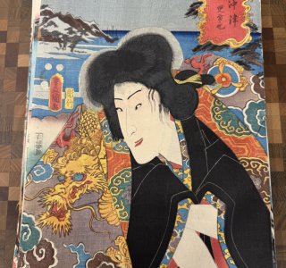 三代 歌川豊国(歌川国貞)による浮世絵「東海道五十三次の内 沖津 児雷也(おきつ じらいや)」です。 「役者見立東海道」と呼ばれるシリーズ作品の一つで、手前に役者絵、背景に演...