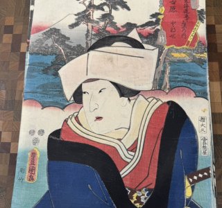 三代 歌川豊国(歌川国貞)による浮世絵「東海道五十三次之内 御油 山本勘助(ごゆ やまもとかんすけ)」です。 「役者見立東海道」と呼ばれるシリーズ作品の一つで、手前に役者絵、...