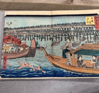 初代 歌川広重による浮世絵「江戸名所 両国橋夕涼(りょうごくばし ゆうすずみ)」です。 歌川広重(1797-1858)は江戸時代の浮世絵師です。「東都名所」のシリーズを皮切り...