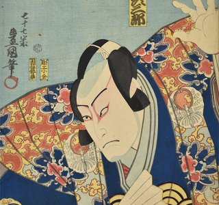 浮世絵師 豊原国周(歌川国周)による1862年の二枚続の作品です。 歌舞伎の「御存 鈴ヶ森」の有名なワンシーンが描かれています。 舞台は夜の鈴ヶ森で、右の十三代 市村羽左衛門は白井権八役を...