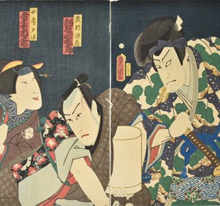 豊原国周(歌川国周)による三人の役者絵です。大判三枚綴となっており、人気の役者を歌舞伎でも人気の役、侠客として見立てています。 左の沢村納升は江戸歌舞伎の侠客らしく手拭を首に掛けて両手で持ち、「...