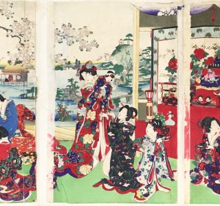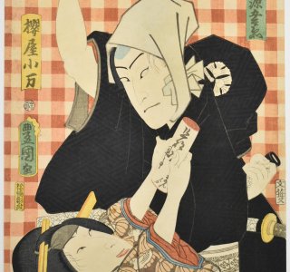 浮世絵師 歌川国貞(三代目歌川豊国)による1858年の二枚続の作品です。 歌舞伎の「絵本太功記」の有名なワンシーンが描かれています。 「絵本太功記」は豊臣秀吉をモデルにした「武智光秀」と、...