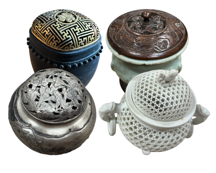 香りを楽しむ: 中に灰を入れ、火のついた炭と香木(こうぼく)を置いて、立ち上る清らかな香りを楽しみます。