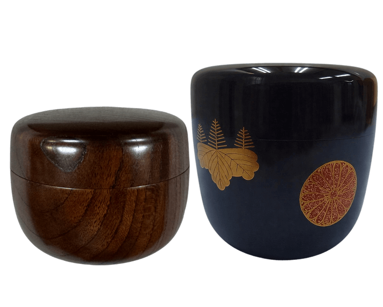 陶磁器の濃茶に対し、薄茶器では漆器や一閑張、その他に木地・竹などが用いられます。漆器には京塗や輪島塗・春慶などがあり、真塗や溜塗、雅やかな蒔絵や沈金を施したものなどその意匠は豊富で、季節や茶会の趣旨にあわせた楽しみが広がる道具のひとつです。使い終わった後は専用の袋(仕覆)や箱に入れて大切に保管されます。
