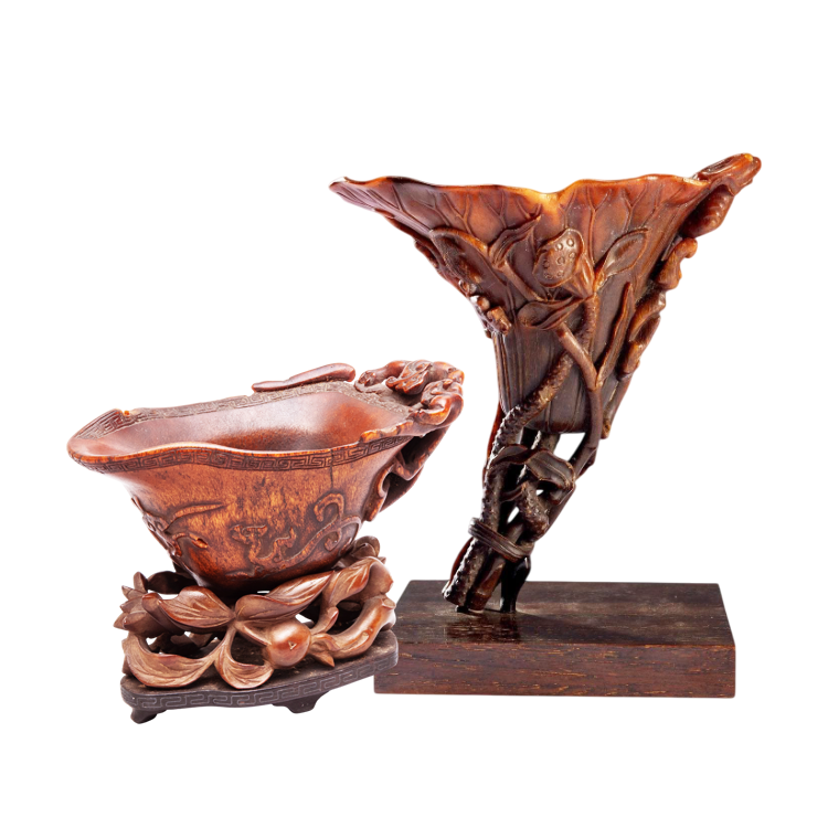 犀角を使った中国美術品として、最も多いものは杯(さかずき)です。杯に花鳥・山水・人物などを肉厚に彫った物が犀角彫刻の代表です。その彫刻技術の高さから、実用というより愛蔵品として使われました。特に中国の明~清時代に発展しました。
